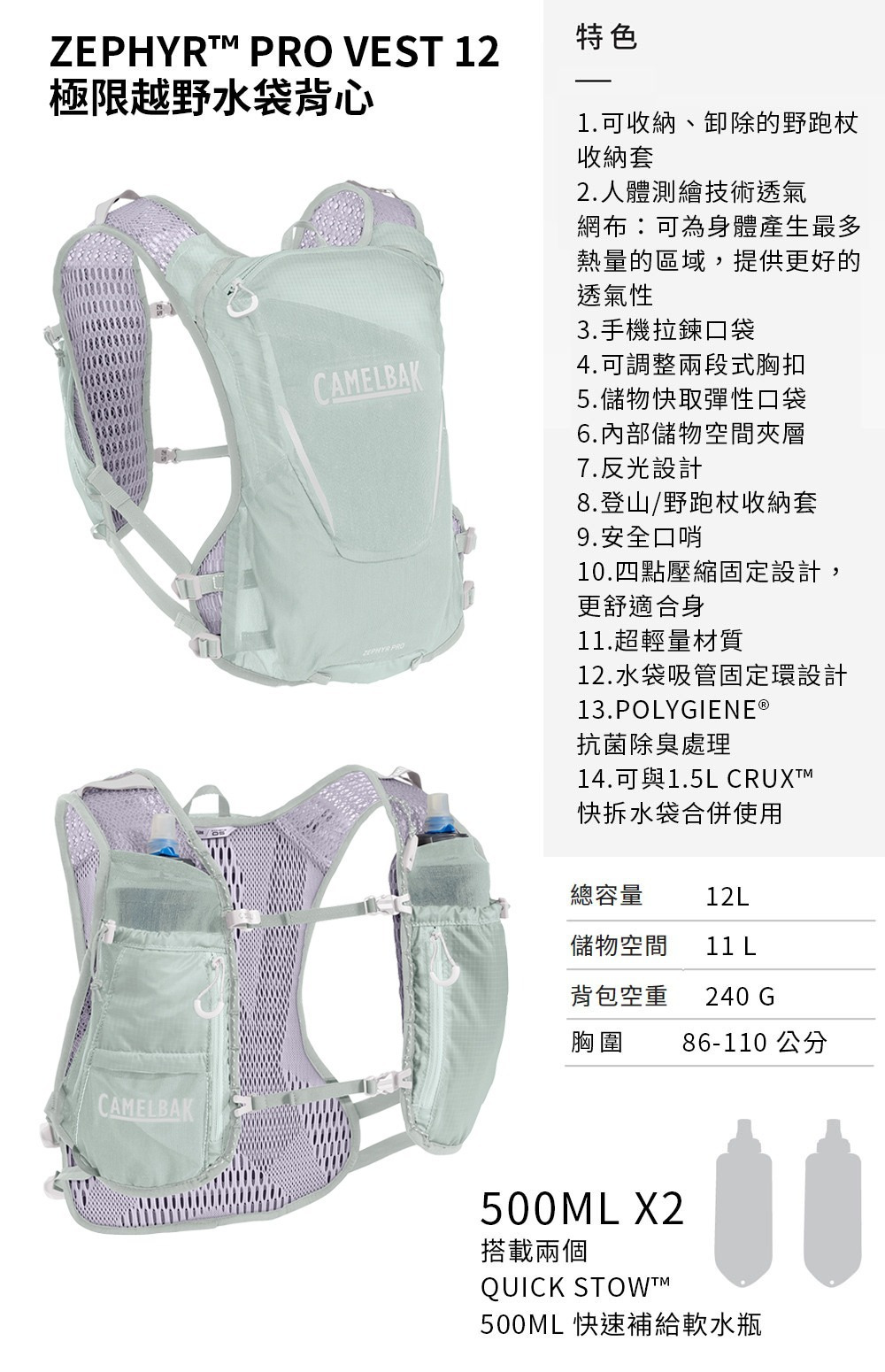 Camelbak Zephyr Pro12 極限越野水袋背心 灰綠 (附0.5L軟水瓶2個)