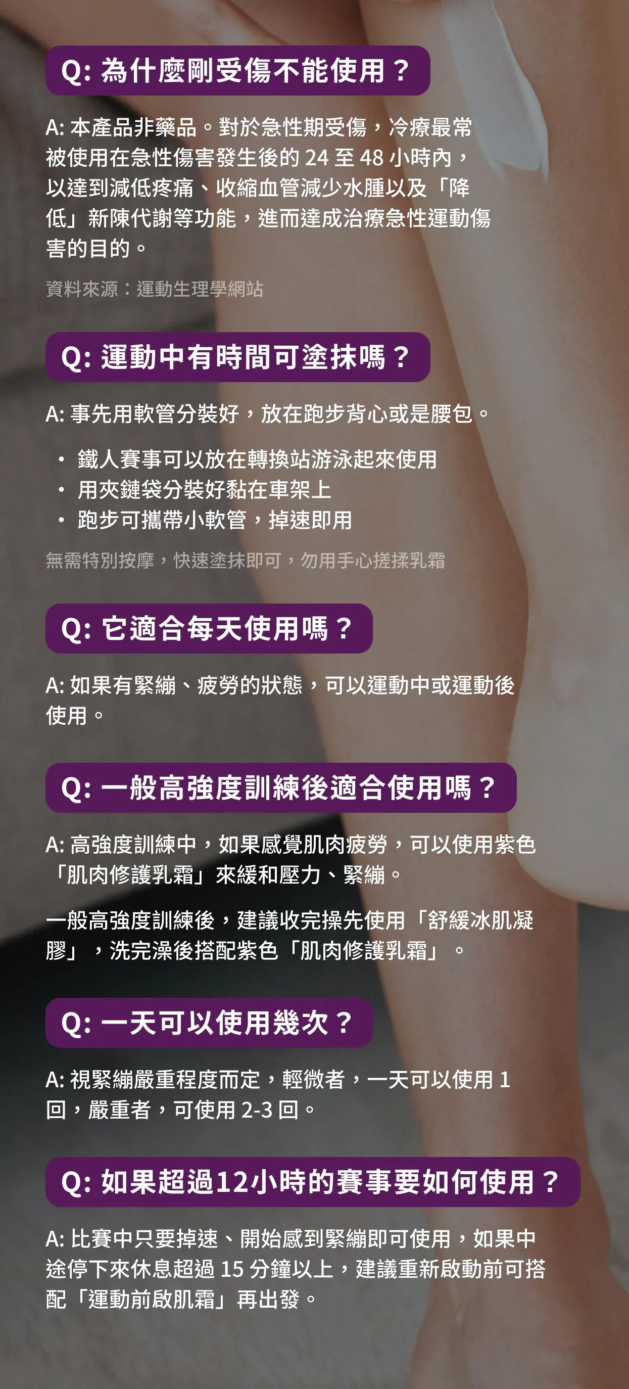♥在高強度運動中或是長時間的賽事,在肌肉感覺到疲勞或是緊繃之前,取用少量塗抹在有運動的部位,賽事中可以多回使用,緩和肌肉疲勞
