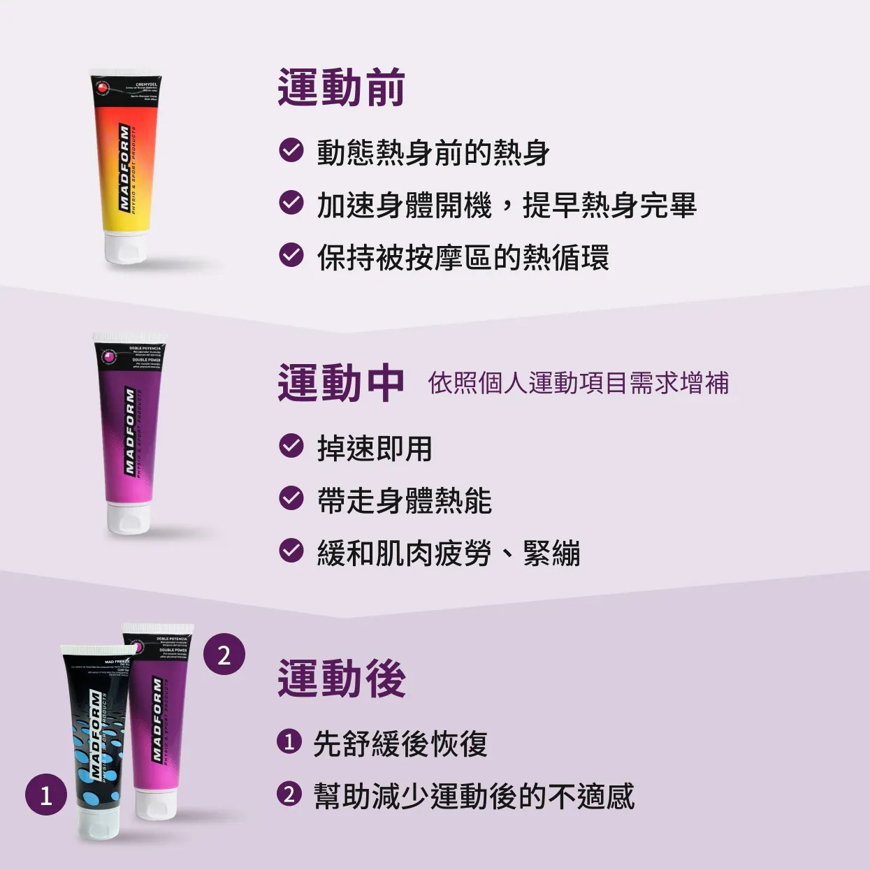 MADFORM的產品設計,是為運動員而生。熱身霜是熱身中的熱身,適用於各種運動、肌力、和身體緊張狀態。