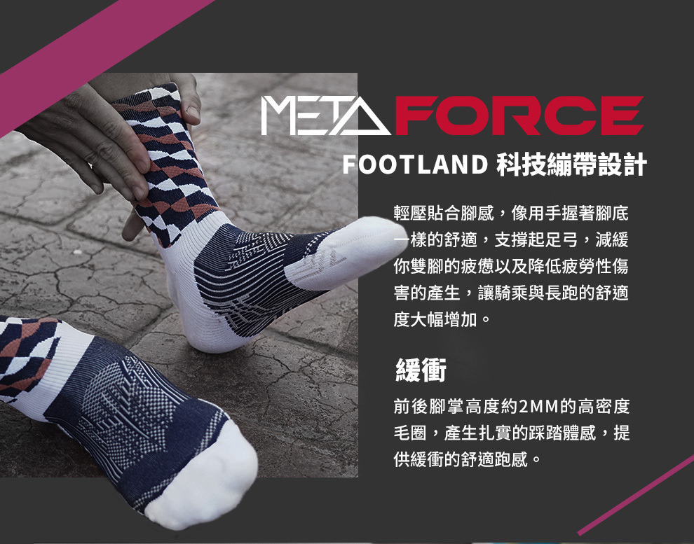A: FOOTLAND針對不同運動需求提供專精專項的適當壓力 分別為 『輕壓貼合感』『中壓手握感』『重壓繃帶感』提供更穩定的運動持久效能透過襪子繃帶科技的壓縮技術,由外而內將肌肉包覆,在肌肉受到衝擊時便可以展現更高的強韌度。