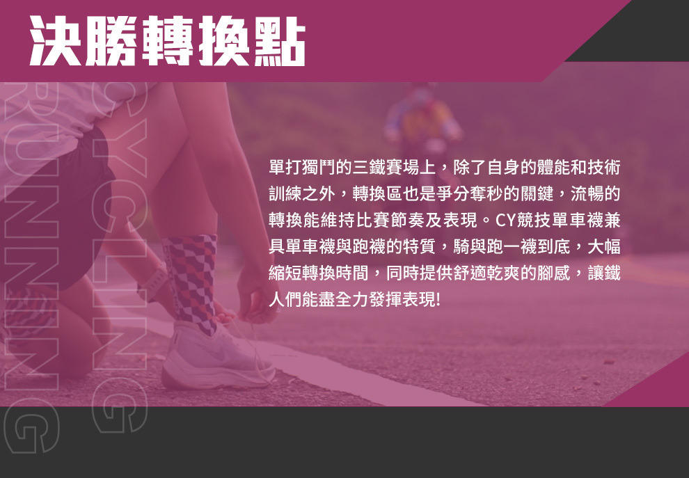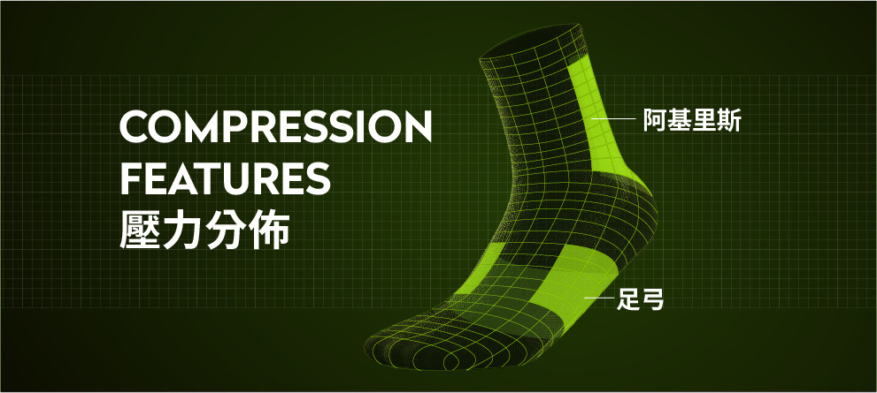 A:運用繃帶包紮8字繃帶與鎖跟紮貼法原理針對腳踝加壓,強化腳踝支撐與保護。8字鎖跟的繃帶機能,在不犧牲關節的活動度下讓襪子可以有效的支撐腳踝的力量,與護具最大的差異在於仍可以維持快速步伐、側向急轉直停、快速跳躍等高度下肢協調需求動作時的靈敏度。