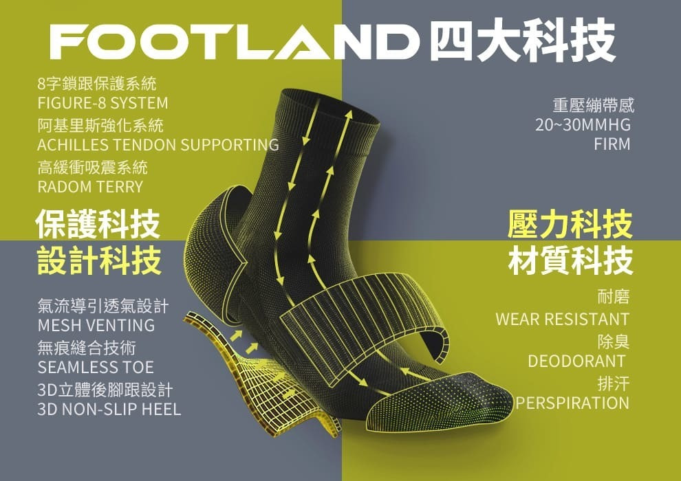 A: FOOTLAND針對不同運動需求提供專精專項的適當壓力 分別為 『輕壓貼合感』『中壓手握感』『重壓繃帶感』提供更穩定的運動持久效能透過襪子繃帶科技的壓縮技術,由外而內將肌肉包覆,在肌肉受到衝擊時便可以展現更高的強韌度。