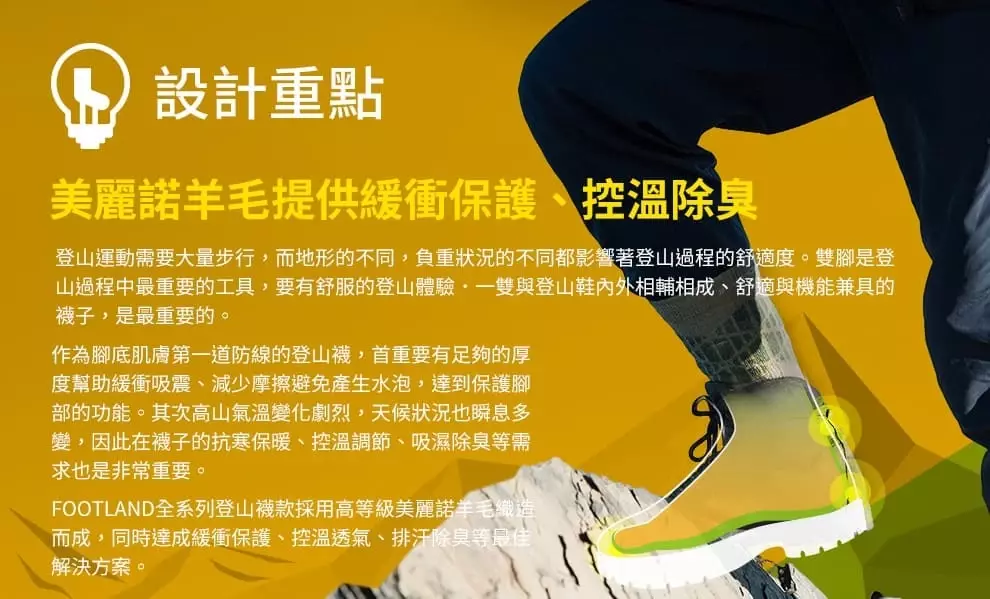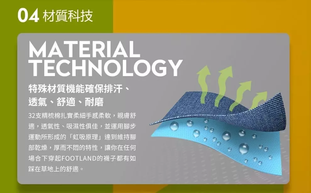A: 除臭對於機能運動襪來說是最基礎的,FOOTLAND針對不同汗量採用兩種抗菌除臭材質,分別為『FACC奈那白炭除臭纖維』與『FOOTLOND Z 氧化鋅除臭纖維』,兩者皆為長效型除臭紗線,安全無毒不傷害肌膚,能有效地吸收各種浮游物質,對硫化物、氯化物、鉀醇、苯、酚等有害化學物質能發揮到吸收、分解異味和消臭的作用。