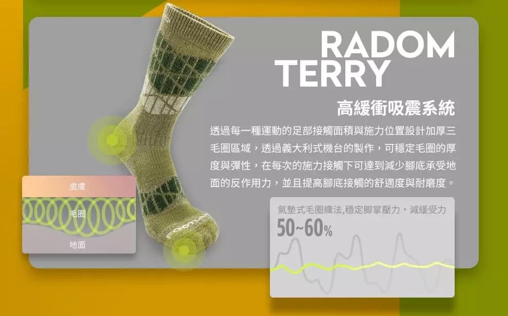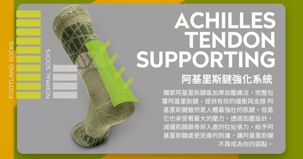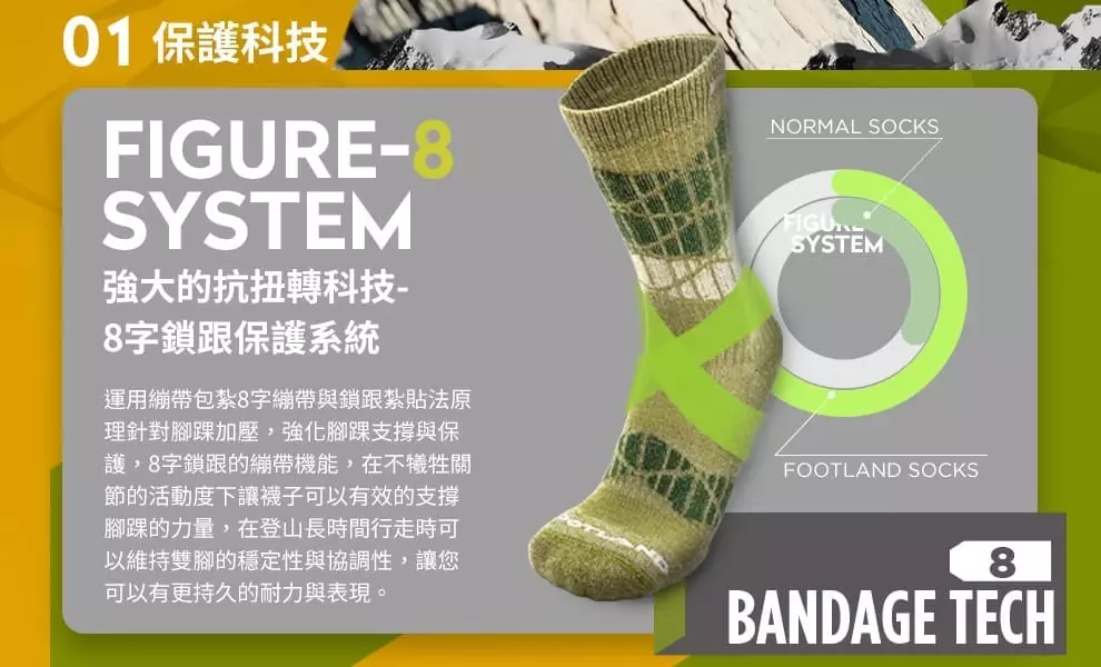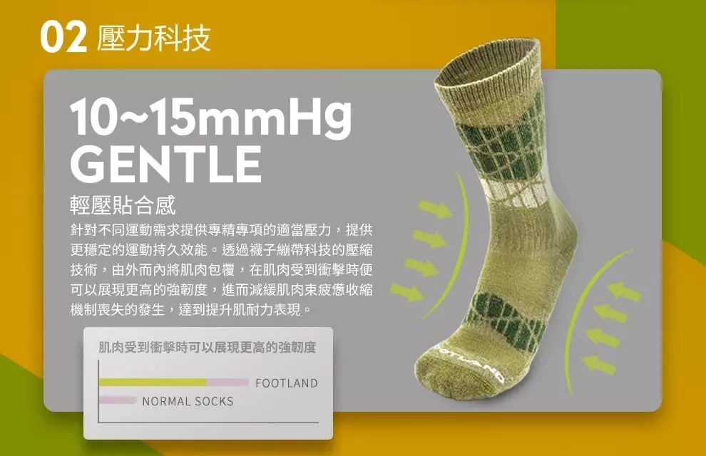 A: FOOTLAND針對不同運動需求提供專精專項的適當壓力 分別為 『輕壓貼合感』『中壓手握感』『重壓繃帶感』提供更穩定的運動持久效能透過襪子繃帶科技的壓縮技術,由外而內將肌肉包覆,在肌肉受到衝擊時便可以展現更高的強韌度。