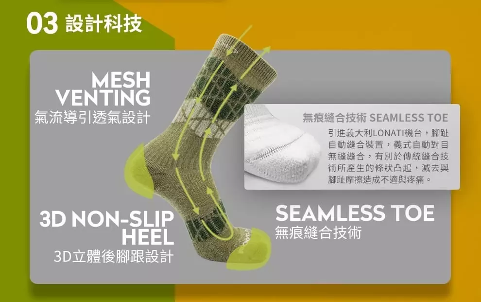 A: 擁有十幾年製襪經驗的的技術團隊, Footland 除了擁有國內圓編織機台,更引進義大利最新Lonati機台,可以任意在襪子的任何部位放置緩衝毛圈,並使用無縫縫合織法,減少腳尖摩擦,提供高度舒適性,製作出符合人體工學與舒適體感的運動襪。 我們以嚴謹的態度製作產品,且不斷改革創新,研發新產品,從生產到出貨所有流程皆在台灣完成。