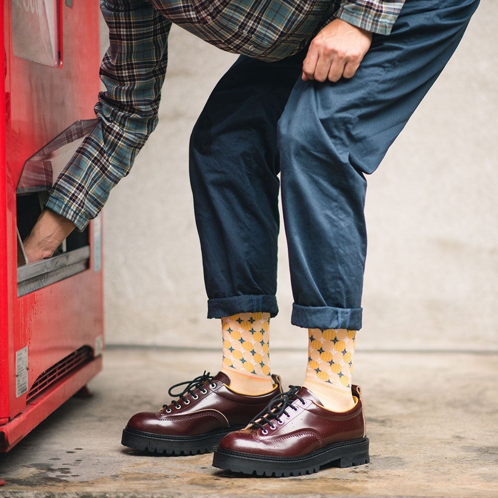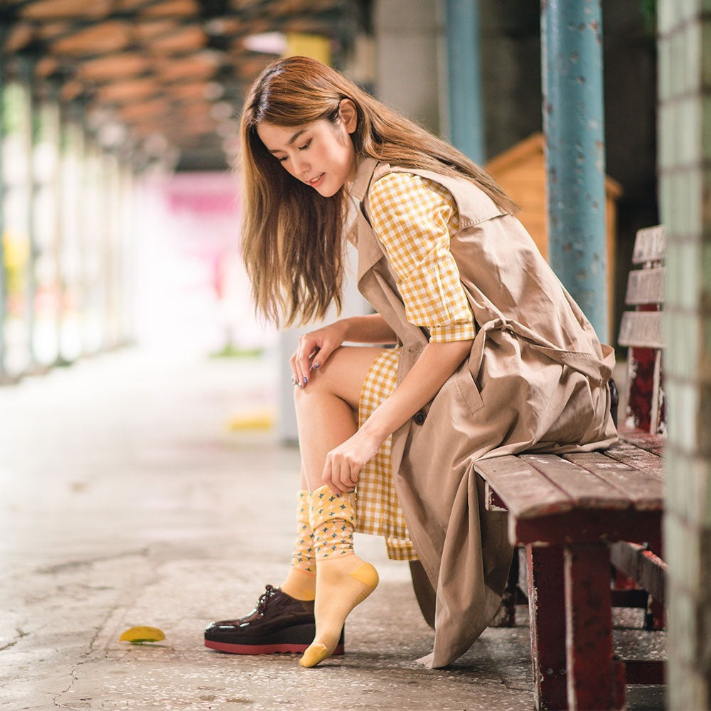 Out Of This World 設計上是採用深淺交錯的圓點,十字與方格,讓人有視覺錯亂的感覺,顏色上使用了代表純真童年的鵝黃色,另外,襪子翻下來後所產生的對比反差,就像走入另一個世界般的美好。