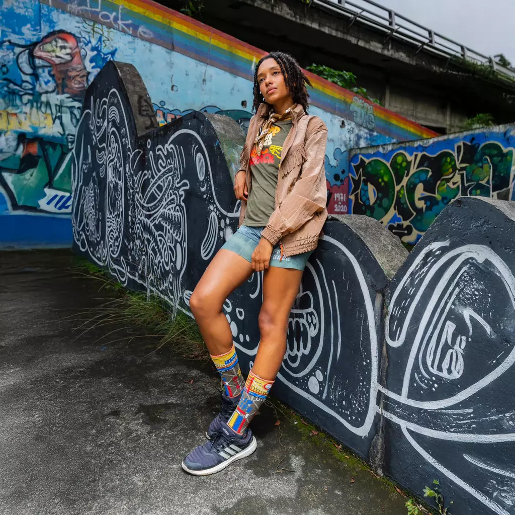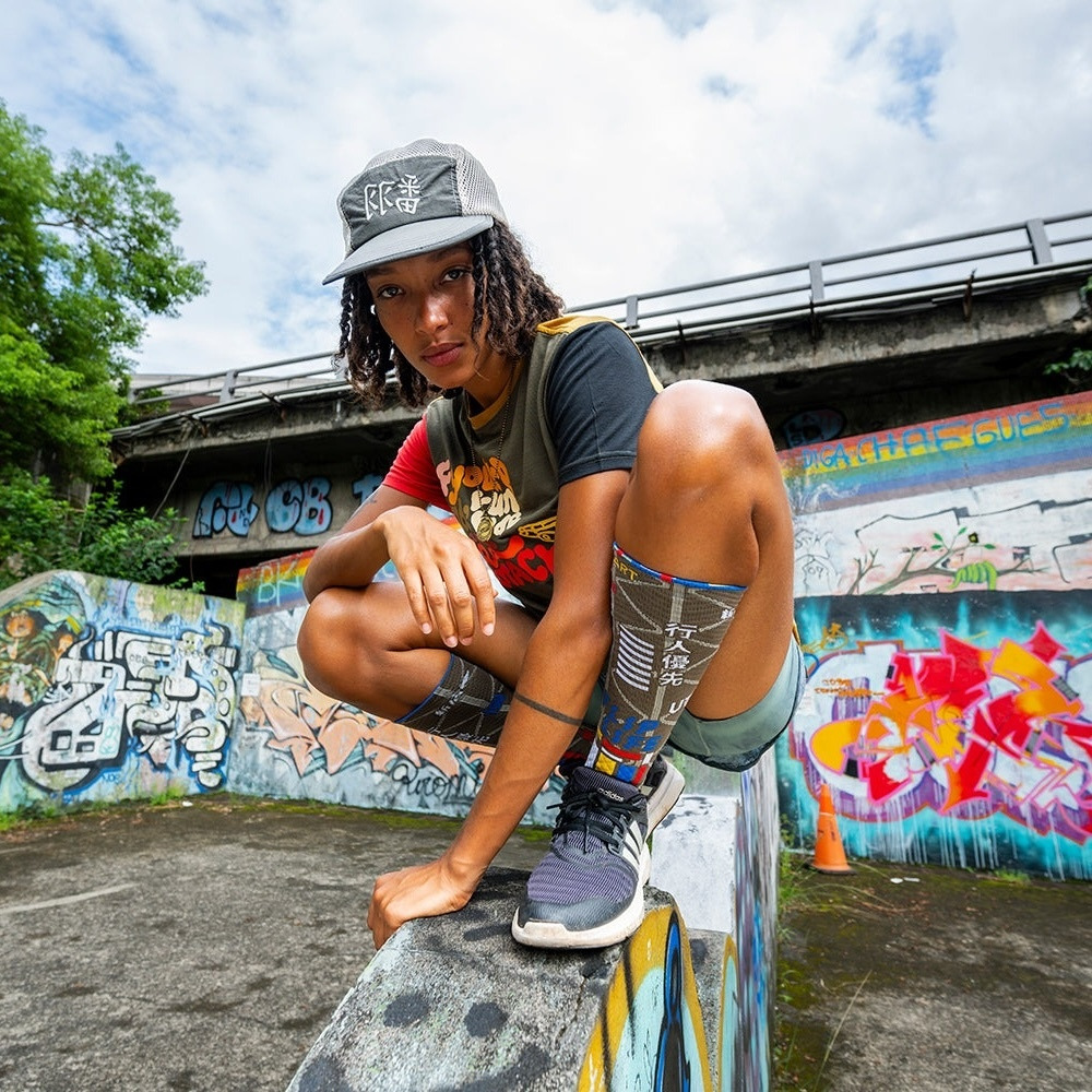 這款襪子的設計靈感來自橋樑,特別是懸索吊橋,象徵文化的孕育、連結與支撐。襪子的正面設計捕捉了福和橋到北新橋這條知名跑者路線的獨特特色,融入城市文化與跑步元素,像是襪面上描繪了沿途的塗鴉創作、道路標示以及象徵性詞彙,如「行人優先」、「斑馬線」和「景美」、「新店」,展現了跑步對城市文化的詮釋和連結。