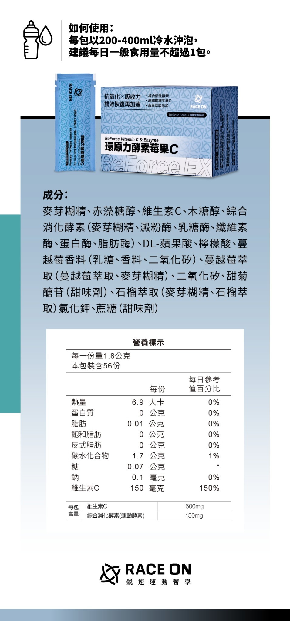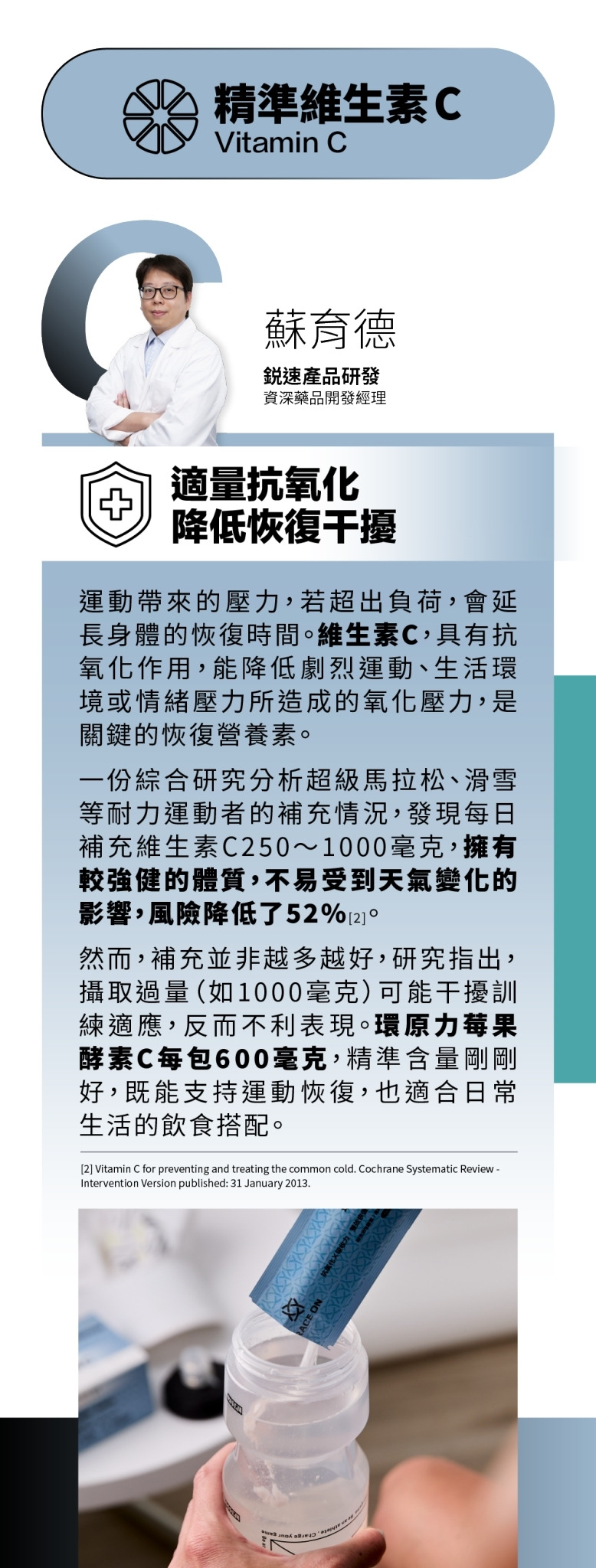 PIC/S GMP國際認證藥廠,監製高品質運動補充品,每包維生素C含量共600mg。