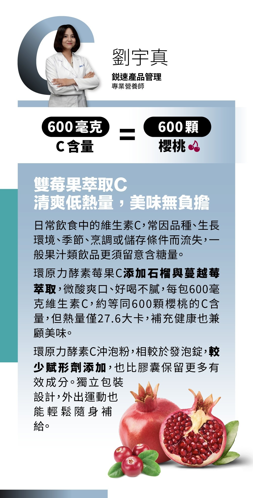 蔓越莓及石榴植物萃取,富含花青素,新陳代謝體內環保,微酸清爽風味佳。