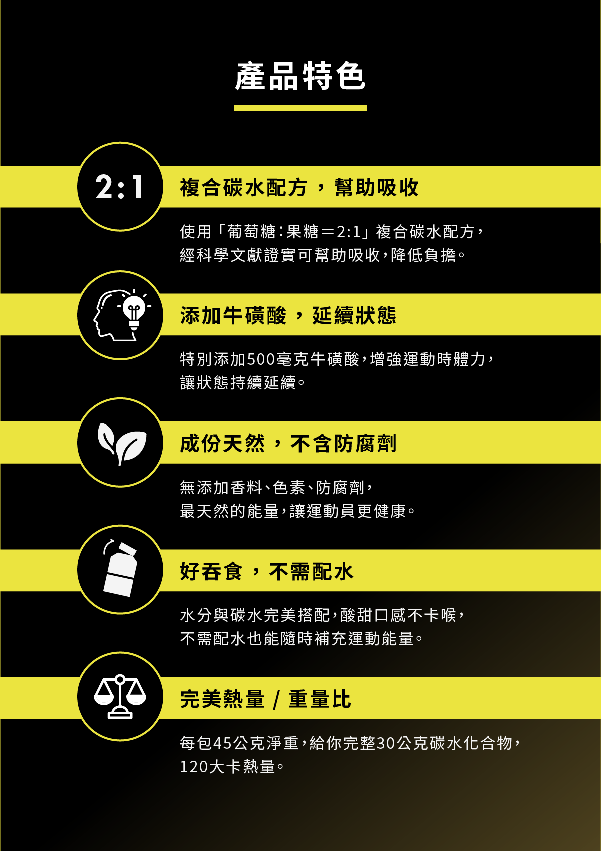 5. 完美熱量/重量比,每包45公克淨重,給你完整30公克碳水化合物,120大卡熱量