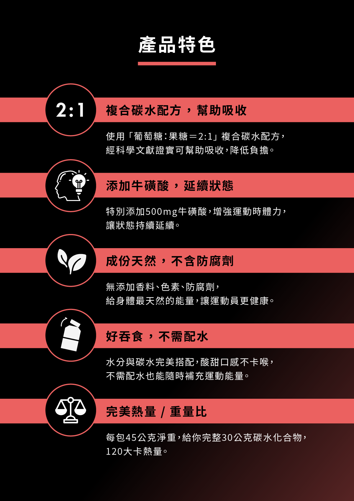 6. 完美熱量/重量比,每包45公克淨重,給你完整30公克碳水化合物,120大卡熱量