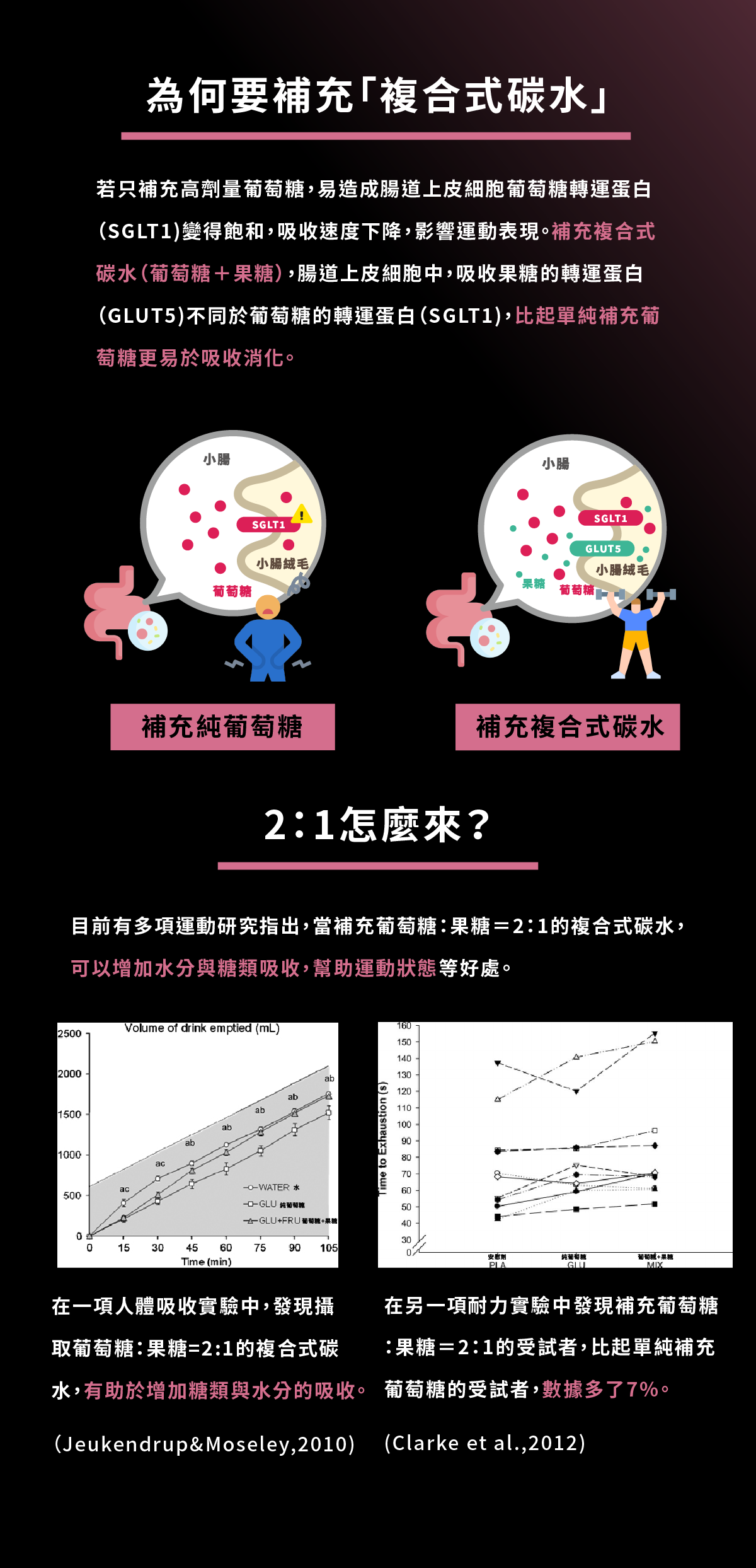 1. 使用葡萄糖:果糖=2:1複合碳水配方,經科學文獻證實可幫助吸收,降低負擔